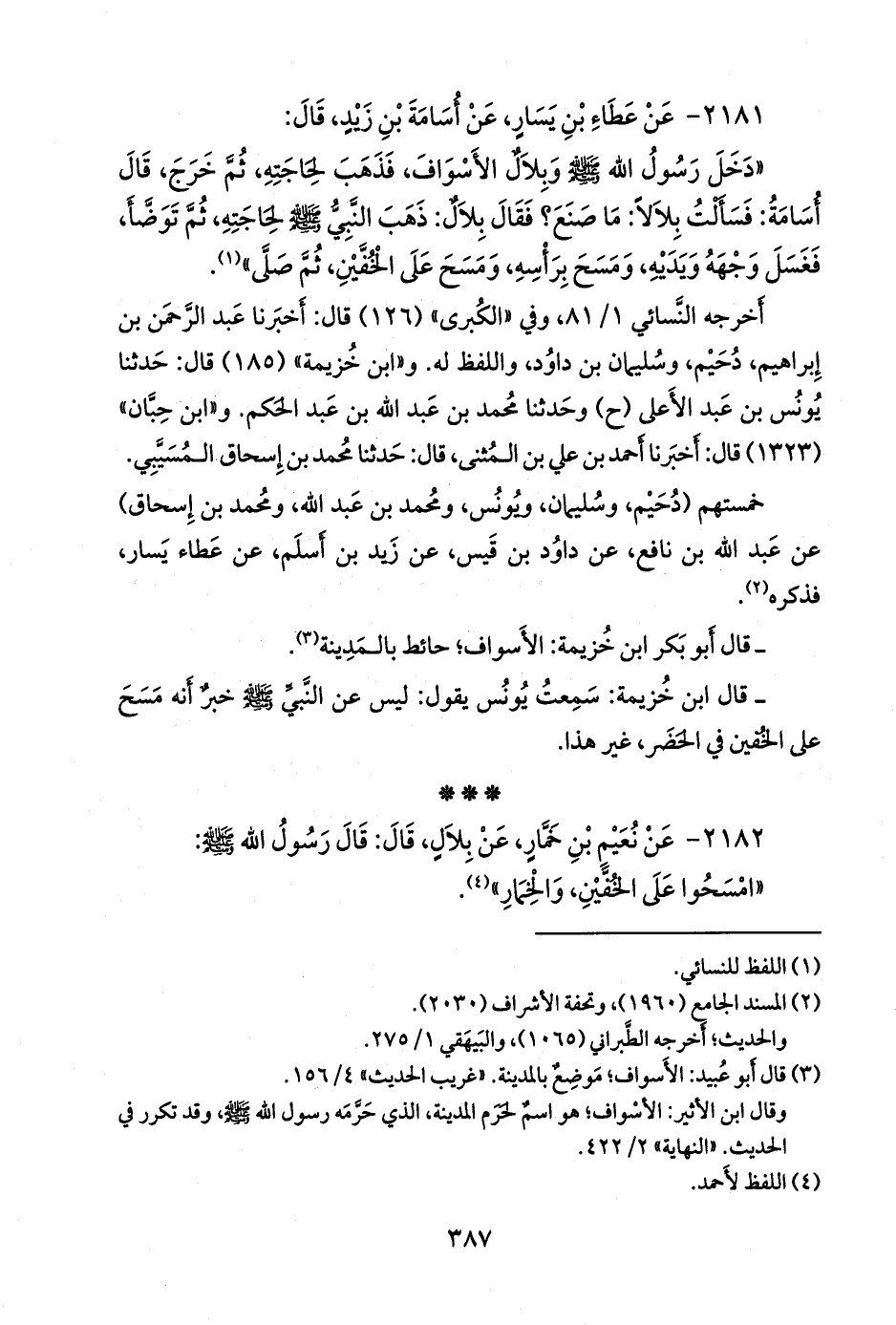 - قال ابن خزيمة: سمعت يونس يقول: ليس عن النبي صَلى الله عَليه وسَلم خبر أنه مسح على الخفين في الحضر، غير هذا.