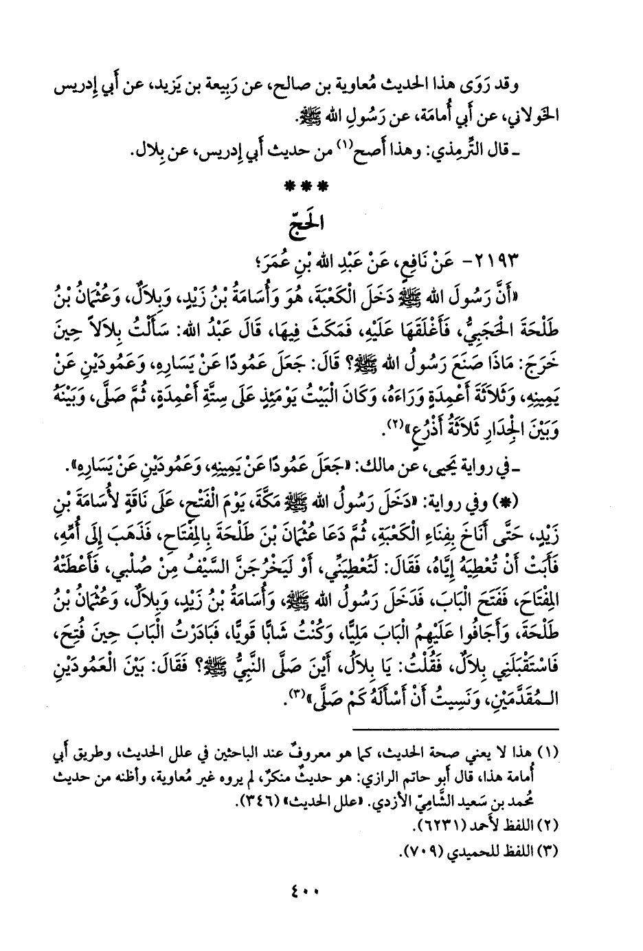 - وفي رواية: «دخل رسول الله صَلى الله عَليه وسَلم مكة، يوم الفتح، على ناقة لأُسامة بن زيد، حتى أناخ بفناء الكعبة، ثم دعا عثمان بن طلحة بالمفتاح، فذهب إلى أمه، فأبت أن تعطيه إياه، فقال: لتعطيني، أو ليخرجن السيف من صلبي، فأعطته المفتاح، ففتح الباب، فدخل رسول الله صَلى الله عَليه وسَلم وأُسامة بن زيد، وبلال، وعثمان بن طلحة، وأجافوا عليهم الباب مليا، وكنت شابا قويا، فبادرت الباب حين فتح، فاستقبلني بلال، فقلت: يا بلال، أين صلى النبي صَلى الله عَليه وسَلم؟ فقال: بين العمودين المقدمين، ونسيت أن أسأله كم صلى» (¬٢).