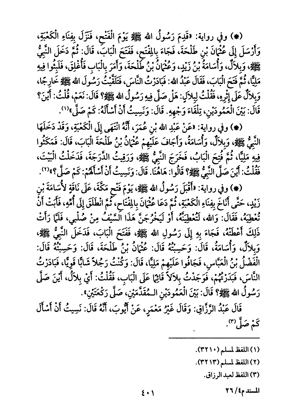- وفي رواية: «أقبل رسول الله صَلى الله عَليه وسَلم يوم فتح مكة، على ناقة لأُسامة بن زيد، حتى أناخ بفناء الكعبة، ثم دعا عثمان بالمفتاح، ثم انطلق إلى أمه، فأبت أن تعطيه، فقال: والله، لتعطينه، أو ليخرجن هذا السيف من صلبي، فلما رأت ذلك أعطته، فجاء به إلى رسول الله صَلى الله عَليه وسَلم ففتح الباب، فدخل النبي صَلى الله عَليه وسَلم وبلال، وأُسامة، قال: وحسبته قال: عثمان بن طلحة، قال: وحسبته قال: الفضل بن العباس، فجافوا عليهم مليا، قال: وكنت رجلا شابا قويا، فبادرت الناس، فبدرتهم، فوجدت بلالا قائمًا على الباب، فقلت: أي بلال، أين صلى رسول الله صَلى الله عَليه وسَلم؟ قال: بين العمودين المقدمين، صلى ركعتين».