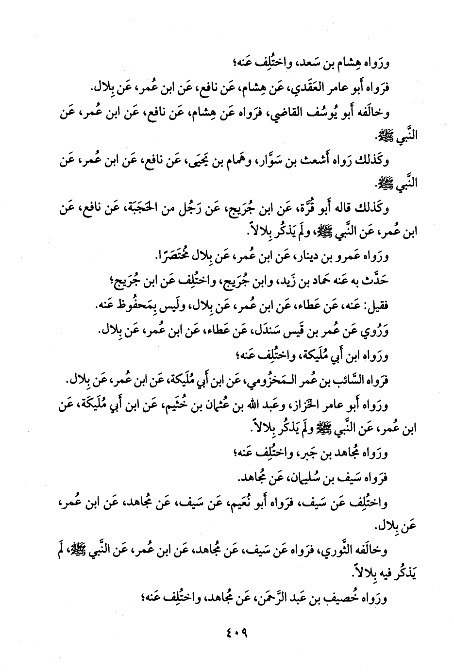 فرواه الأوزاعي، ومروان بن شجاع، وعتاب بن بشير، عن خصيف، عن مجاهد، عن ابن عمر، عن بلال، عن النبي صَلى الله عَليه وسَلم.
