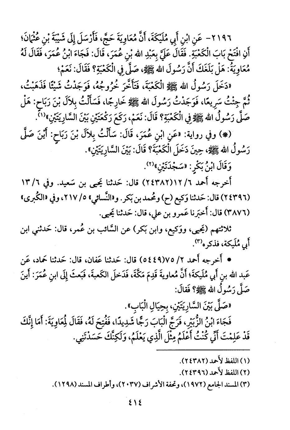 ٢١٩٦ - عن ابن أَبي مُليكة، أن معاوية حج، فأرسل إلى شيبة بن عثمان؛ أن افتح باب الكعبة. فقال علي بعبد الله بن عمر، قال: فجاء ابن عمر، فقال له معاوية: هل بلغك أن رسول الله صَلى الله عَليه وسَلم صلى في الكعبة؟ فقال: نعم؛