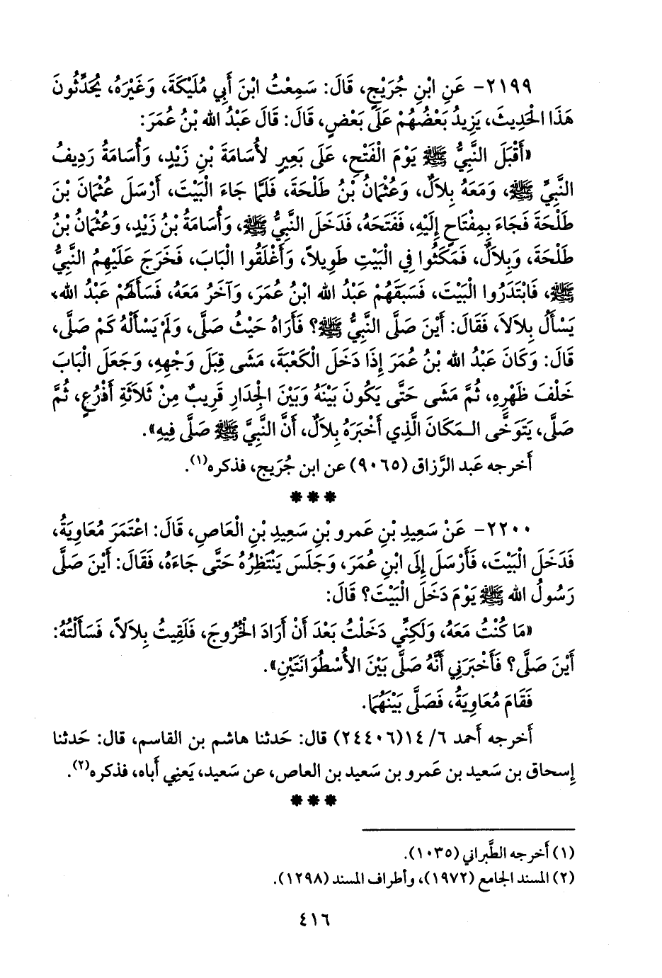 ٢٢٠٠ - عن سعيد بن عَمرو بن سعيد بن العاص، قال: اعتمر معاوية، فدخل البيت، فأرسل إلى ابن عمر، وجلس ينتظره حتى جاءه، فقال: أين صلى رسول الله صَلى الله عَليه وسَلم يوم دخل البيت؟ قال: