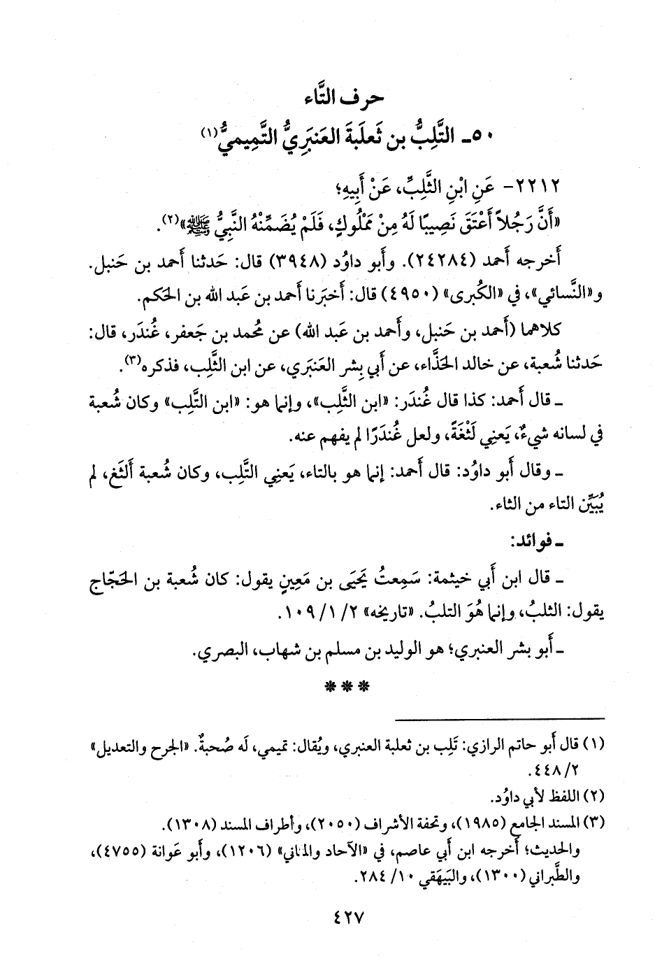 (¬١) قال أَبو حاتم الرازي: تلب بن ثعلبة العنبري، ويقال: تميمي، له صحبة. «الجرح والتعديل» ٢/ ٤٤٨.