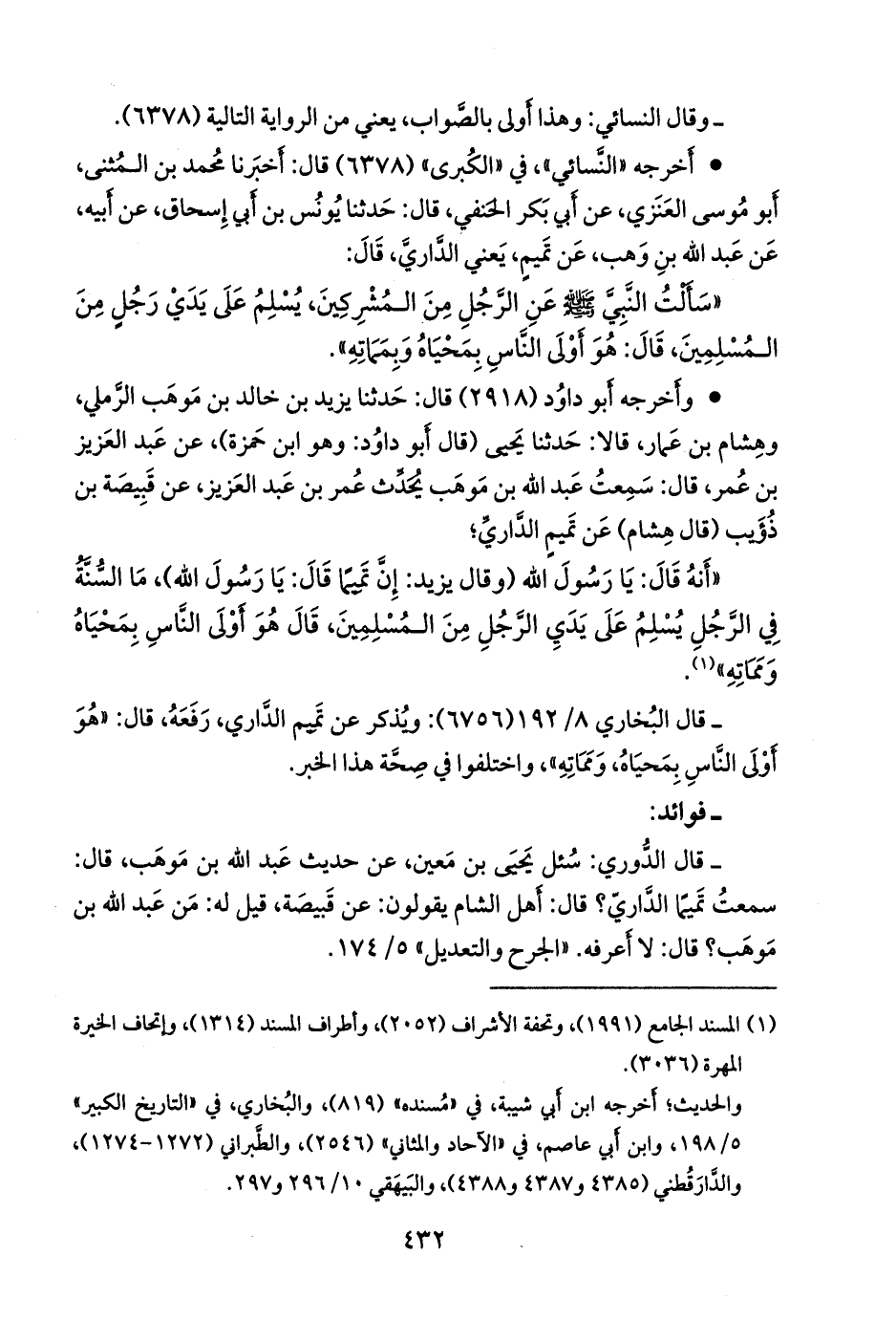 - قلنا: إِسناده ضعيفٌ؛ قال عباس الدُّوري: سئل يحيى بن مَعين، عن حديث عبد الله بن مَوهَب، قال: سمعت تميما الداري؟ قال: أهل الشام يقولون: عن قَبيصَة، قيل له: من عبد الله بن مَوهَب؟ قال: لا أعرفه. «الجرح والتعديل» ٥/ ١٧٤.