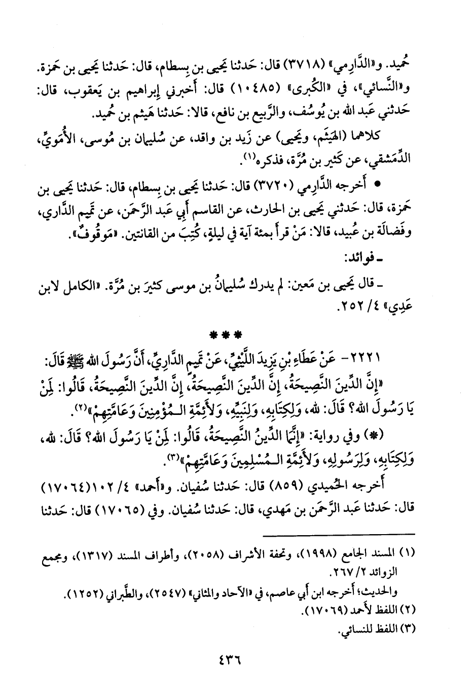 ٢٢٢١ - عن عطاء بن يزيد الليثي، عن تميم الداري، أن رسول الله صَلى الله عَليه وسَلم قال: