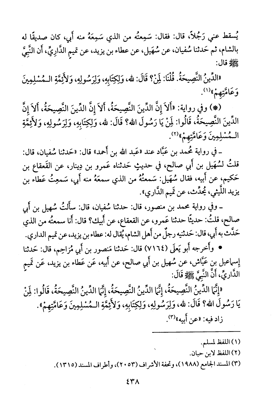 - وفي رواية: «ألا إن الدين النصيحة، ألا إن الدين النصيحة، ألا إن الدين النصيحة، قالوا: لمن يا رسول الله؟ قال: لله، ولكتابه، ولرسوله، ولأئمة المسلمين وعامتهم» (¬١).