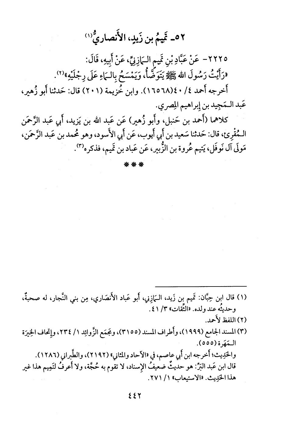 قلنا: إسناده ضعيفٌ؛ قال ابن عبد البَر: تميم المازني الأَنصاري، روى عنه ابنه عباد بن تَميم، في الوضوء، قال: رأَيتُ رسول الله صَلى الله عَليه وسَلم يتوضأ، ويمسحُ الماء على رجليه، هو حديثٌ ضعيفُ الإِسناد، لا تقوم به حُجة.