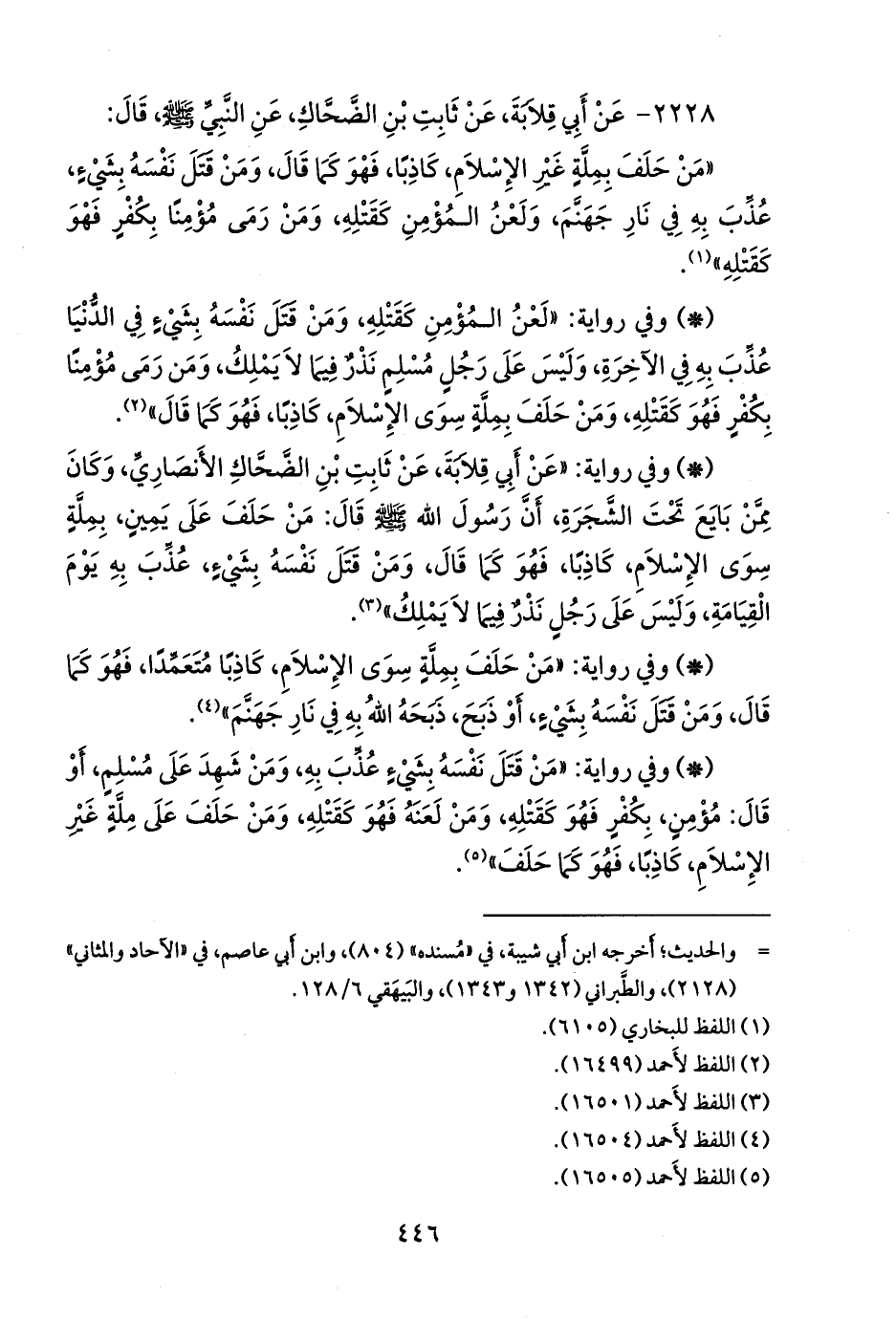 ٢٢٢٨ - عن أبي قلابة، عن ثابت بن الضحاك، عن النبي صَلى الله عَليه وسَلم قال:
