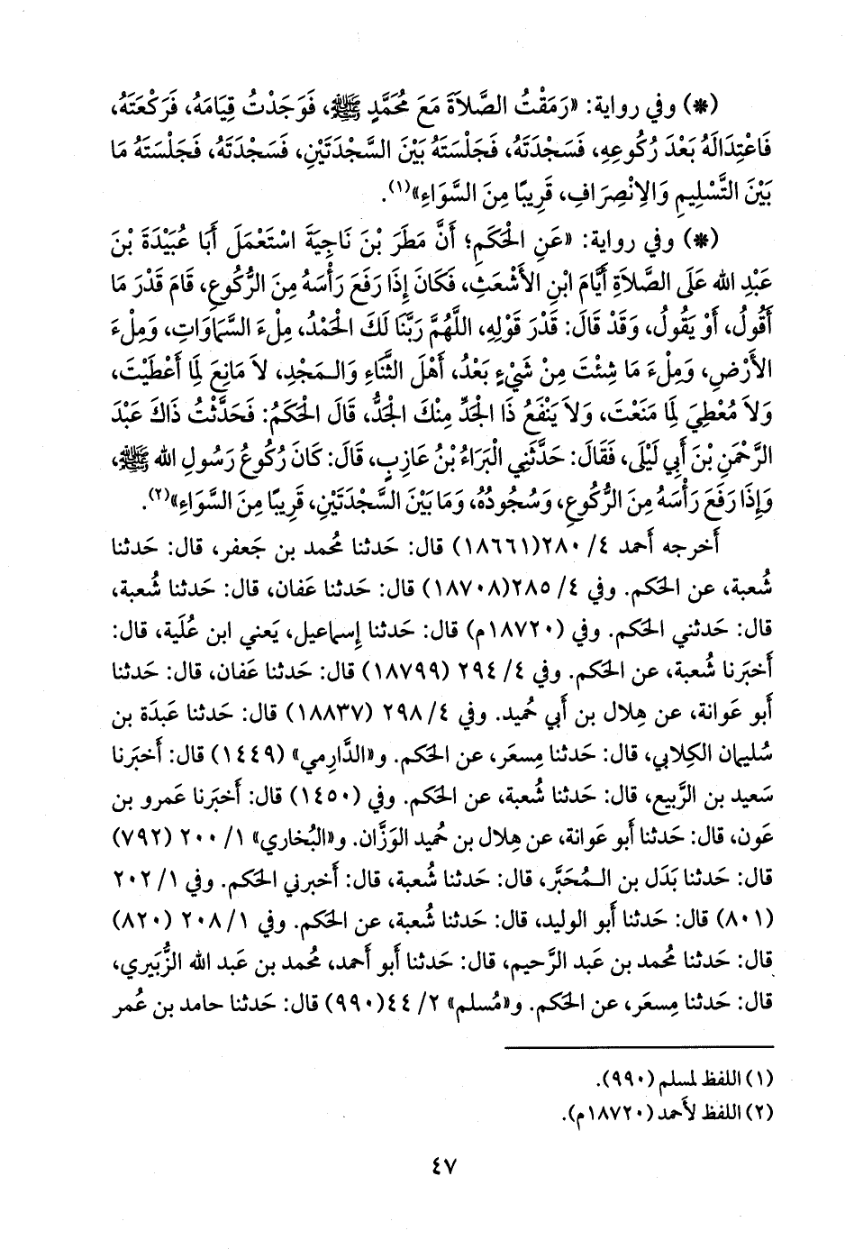 - وفي رواية: «عن الحكم؛ أن مطر بن ناجية استعمل أبا عبيدة بن عبد الله على الصلاة أيام ابن الأشعث، فكان إذا رفع رأسه من الركوع، قام قدر ما أقول، أو يقول، وقد قال: قدر قوله، اللهم ربنا لك الحمد، ملء السماوات، وملء الأرض، وملء ما شئت من شيء بعد، أهل الثناء والمجد، لا مانع لما أعطيت، ولا معطي لما منعت، ولا ينفع ذا الجد منك الجد، قال الحكم: فحدثت ذاك عبد الرَّحمَن بن أبي ليلى، فقال: حدثني البراء بن عازب، قال: كان ركوع رسول الله صَلى الله عَليه وسَلم وإذا رفع رأسه من الركوع، وسجوده، وما بين السجدتين، قريبا من السواء» (¬١).