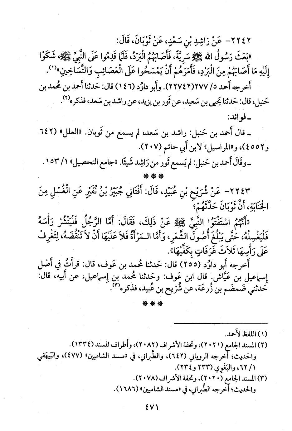 ٢٢٤٣ - عن شريح بن عبيد، قال: أفتاني جُبير بن نُفير عن الغسل من الجنابة، أن ثوبان حدثهم؛