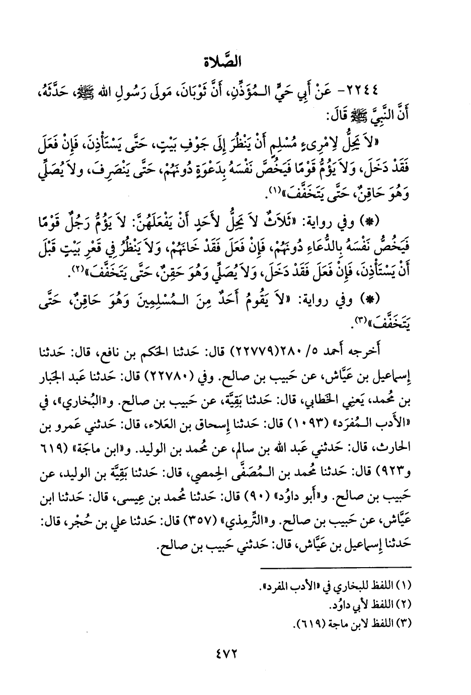 ٢٢٤٤ - عن أبي حي المؤذن، أن ثوبان مولى رسول الله صَلى الله عَليه وسَلم حدثه، أن النبي صَلى الله عَليه وسَلم قال: