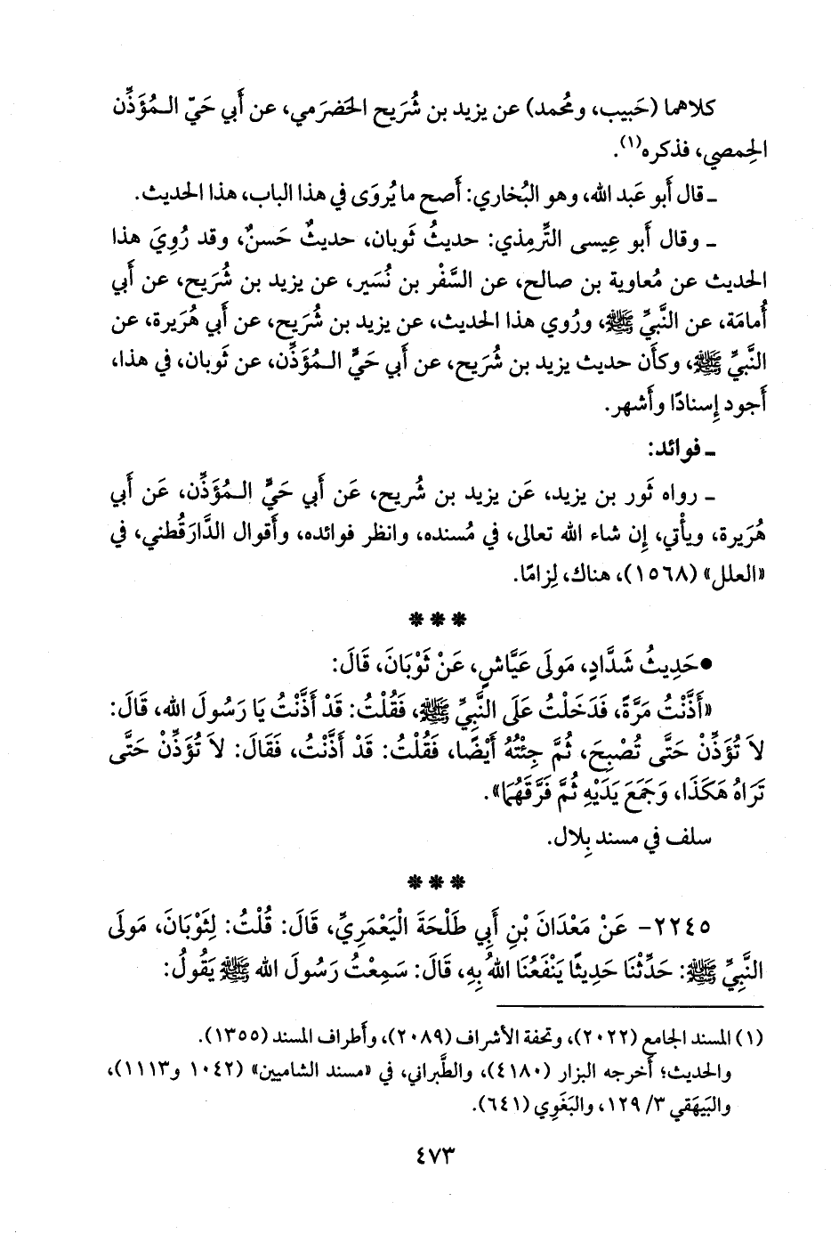 () كذا ورد في النسخ الخطية، والطبعات الثلاث: المجلس العلمي، والكتب العلمية، والتأصيل: «عن شداد مولى عباس، عن ثوبان»، وفي جميع طرق تخريج هذا الحديث: «عن شداد مولى عياض، عن بلال»، إلا أن محقق التأصيل بدل: «مولى عباس» إلى: «مولى عياض» مع إقراره بأن الذي في أصله: «مولى عباس»، وسلف في مسند بلال بن رباح، رضي الله تعالى عنه، برقم ().