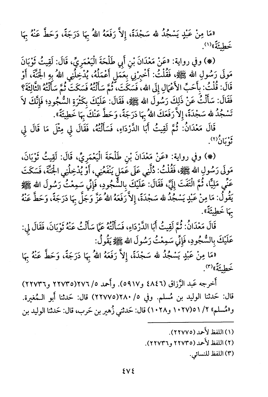 قال معدان: ثم لقيت أبا الدرداء، فسألته عما سألت عنه ثوبان، فقال لي: عليك بالسجود، فإني سمعت رسول الله صَلى الله عَليه وسَلم يقول: