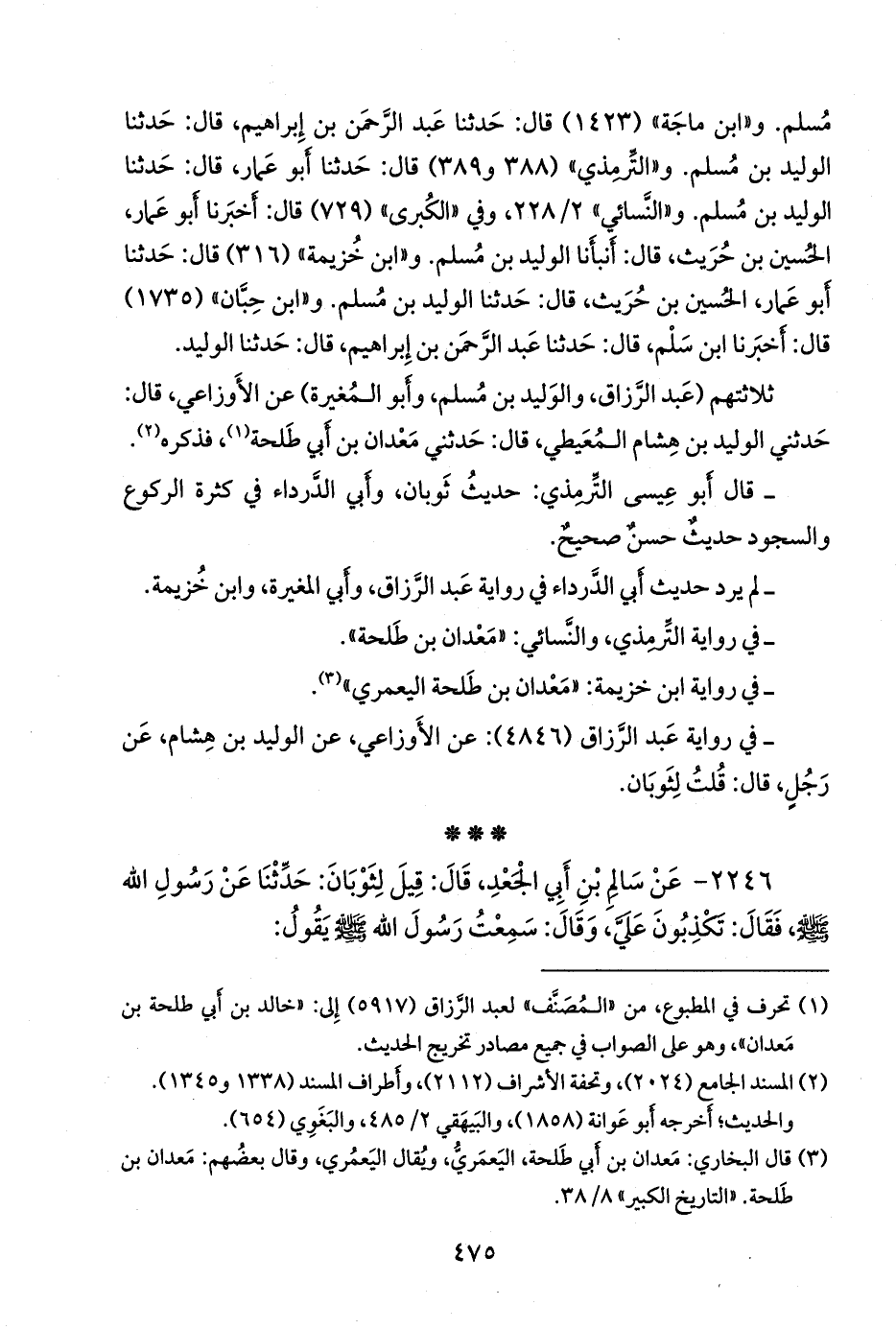 ثلاثتهم (عبد الرزاق بن همام، والوليد بن مسلم، وأَبو المغيرة عبد القدوس بن الحجاج) عن عبد الرَّحمَن بن عَمرو الأَوزاعي، قال: حدثني الوليد بن هشام المُعَيطي، قال: حدثني مَعدان بن أَبي طلحة، فذكره (¬١).