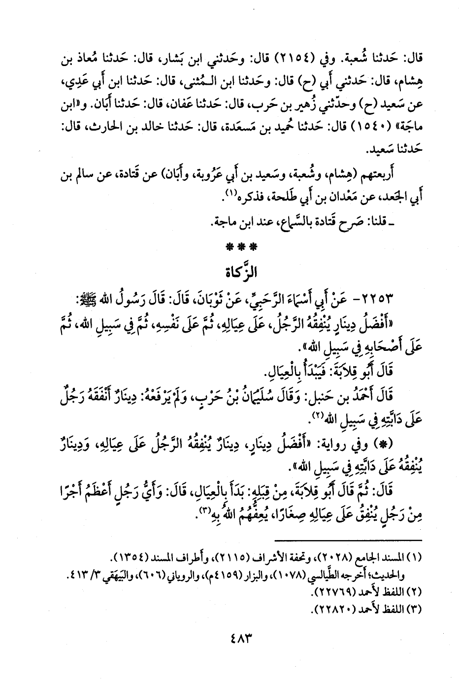 - وفي رواية: «أفضل دينار ينفقه الرجل، دينار ينفقه على عياله، ودينار ينفقه الرجل على دابته في سبيل الله، ودينار ينفقه على أصحابه في سبيل الله».