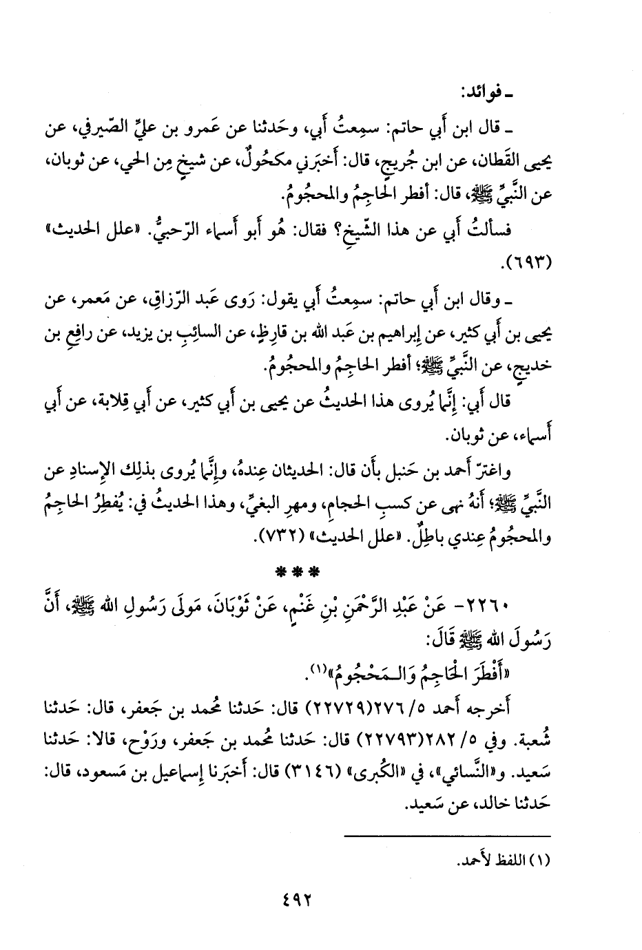 - قال عبد الرَّحمَن بن أبي حاتم الرازي: سمعت أبي، وحدثنا عن عَمرو بن علي الصيرفي، عن يحيى القطان، عن ابن جُريج، قال: أخبرني مكحول، عن شيخ من الحي، عن ثوبان، عن النبي صَلى الله عَليه وسَلم قال: أفطر الحاجم والمحجوم.