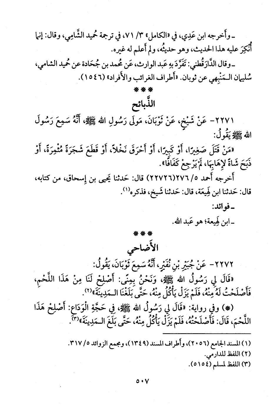 «من قتل صغيرا، أو كبيرا، أو أحرق نخلا، أو قطع شجرة مثمرة، أو ذبح شاة لإهابها، لم يرجع كفافا».