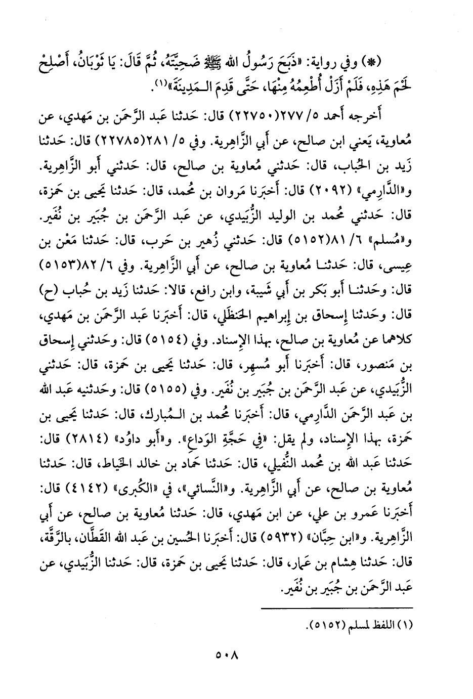 و «مسلم» ٦/ ٨١ (٥١٥٢) قال: حدثني زهير بن حرب، قال: حدثنا مَعن بن عيسى، قال: حدثنا معاوية بن صالح، عن أبي الزاهرية. وفي ٦/ ٨٢ (٥١٥٣) قال: وحدثنا أَبو بكر بن أبي شيبة، وابن رافع، قالا: حدثنا زيد بن حباب (ح) قال: وحدثنا إسحاق بن إبراهيم الحنظلي، قال: أخبرنا عبد الرَّحمَن بن مهدي، كلاهما عن معاوية بن صالح، بهذا الإسناد. وفي (٥١٥٤) قال: وحدثني إسحاق بن منصور، قال: أخبرنا أَبو مسهر، قال: حدثنا يحيى بن حمزة، قال: حدثني الزبيدي، عن عبد الرَّحمَن بن جُبير بن نُفير. وفي (٥١٥٥) قال: وحدثنيه عبد الله بن عبد الرَّحمَن الدَّارِمي، قال: أخبرنا محمد بن المبارك، قال: حدثنا يحيى بن حمزة، بهذا الإسناد، ولم يقل: «في حجة الوداع». و «أَبو داود» (٢٨١٤) قال: حدثنا عبد الله بن محمد النفيلي، قال: حدثنا حماد بن خالد الخياط، قال: حدثنا معاوية بن صالح، عن أبي الزاهرية. و «النَّسَائي» في «الكبرى» (٤١٤٢) قال: أخبرنا عَمرو بن علي، عن ابن مهدي، قال: حدثنا معاوية بن صالح، عن أبي الزاهرية. و «ابن حِبَّان» (٥٩٣٢) قال: أخبرنا الحسين بن عبد الله القطان، بالرَّقَّة، قال: حدثنا هشام بن عمار، قال: حدثنا يحيى بن حمزة، قال: حدثنا الزبيدي، عن عبد الرَّحمَن بن جُبير بن نُفير.
