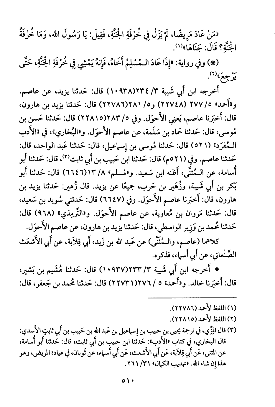 حدثنا شعبة، عن عاصم الأحول. وفي (٢٢٧٣٣) قال: حدثنا محمد بن جعفر، قال: حدثنا شعبة، عن خالد. وفي ٥/ ٢٧٩ (٢٢٧٦٧) قال: حدثنا يونس، وعفان، قالا: حدثنا حماد، عن أيوب. وفي (٢٢٧٧١) قال: حدثنا علي بن عاصم، عن خالد. وفي ٥/ ٢٨٢ (٢٢٨٠٣) قال: حدثنا عبد الرَّحمَن بن مهدي، قال: حدثنا حماد، يعني ابن زيد، عن أيوب. وفي ٥/ ٢٨٣ (٢٢٨٠٨) قال: حدثنا يونس، قال: حدثنا يزيد بن زُريع، عن خالد الحَذَّاء. وفي (٢٢٨١٠) قال: حدثنا عبد الوَهَّاب الخفاف، قال: حدثنا خالد. و «مسلم» ٨/ ١٢ (٦٦٤٣) قال: حدثنا سعيد بن منصور، وأَبو الربيع الزهراني، قالا: حدثنا حماد، يعنيان ابن زيد، عن أيوب. وفي (٦٦٤٤) قال: حدثنا يحيى بن يحيى التميمي، قال: أخبرنا هُشيم، عن خالد. وفي ٨/ ١٣ (٦٦٤٥) قال: حدثنا يحيى بن حبيب الحارثي، قال: حدثنا يزيد بن زُريع، قال: حدثنا خالد.
