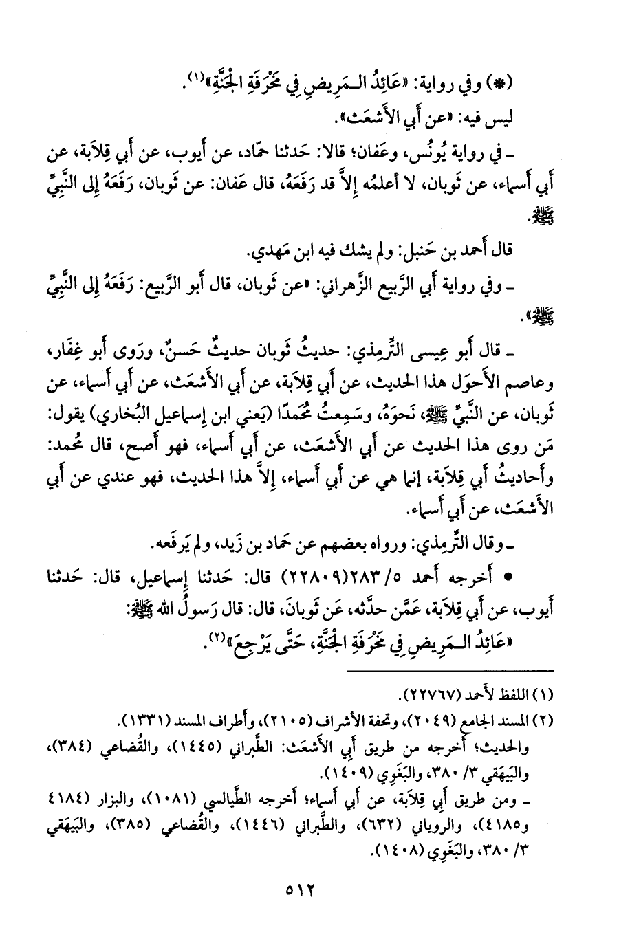 - قال التِّرمِذي: حديث ثوبان حديثٌ حسنٌ، وروى أَبو غفار، وعاصم الأحول هذا الحديث، عن أبي قلابة، عن أبي الأشعث، عن أبي أسماء، عن ثوبان، عن النبي صَلى الله عَليه وسَلم نحوه، وسمعت محمدا، يعني ابن إسماعيل البخاري، يقول: من روى هذا الحديث عن أبي الأشعث، عن أبي أسماء، فهو أصح، قال محمد: وأحاديث أبي قلابة، إنما هي عن أبي أسماء، إلا هذا الحديث، فهو عندي عن أبي الأشعث، عن أبي أسماء.