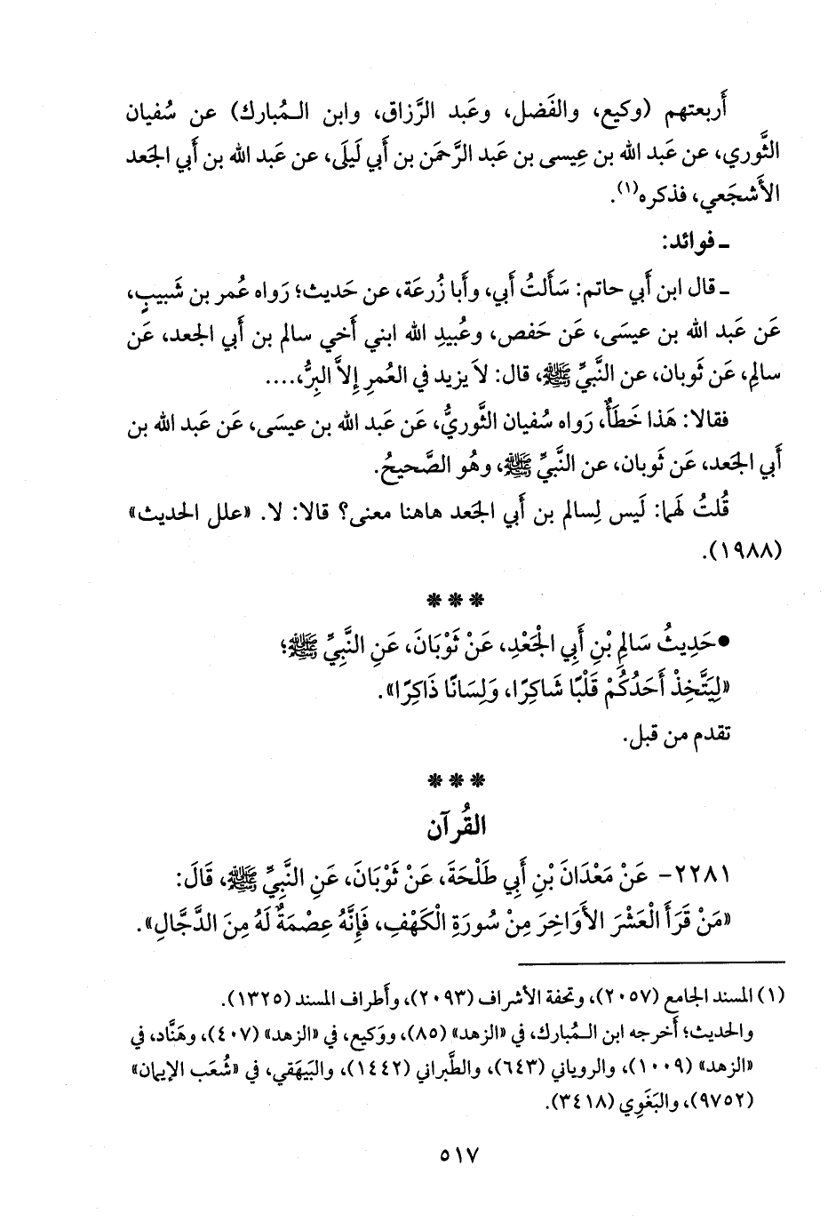 • حديث سالم بن أبي الجعد، عن ثوبان، عن النبي صَلى الله عَليه وسَلم؛