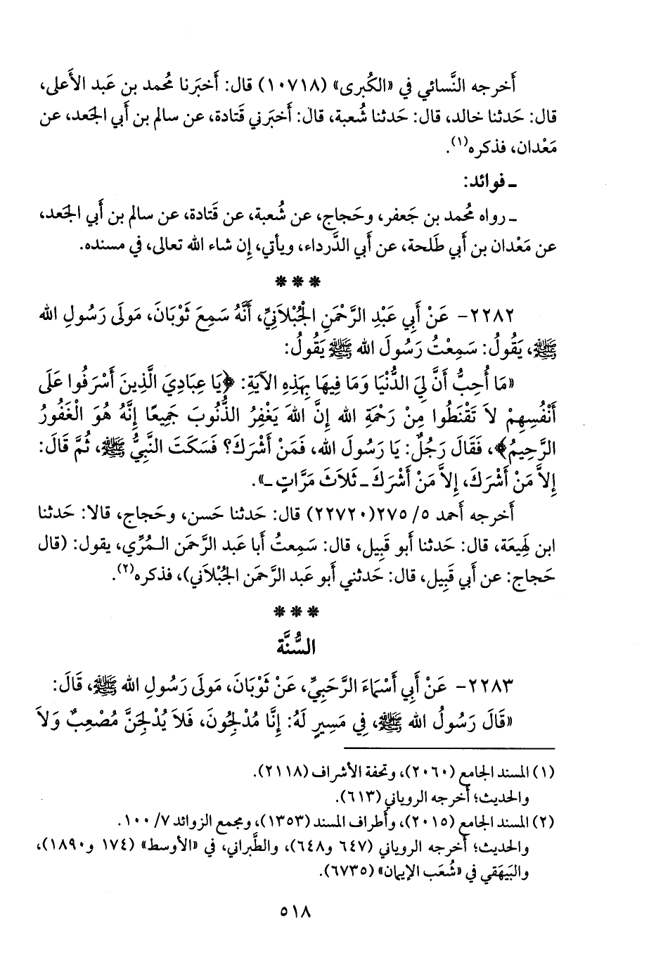 ٢٢٨٢ - عن أبي عبد الرَّحمَن الجبلاني، أنه سمع ثوبان مولى رسول الله صَلى الله عَليه وسَلم يقول: سمعت رسول الله صَلى الله عَليه وسَلم يقول: