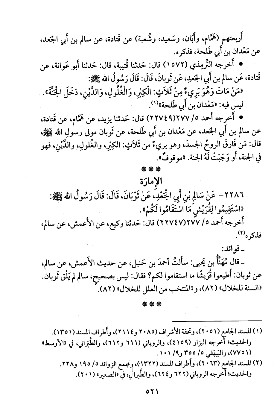 - قلنا: إِسناده ضعيفٌ؛ قال مُهَنَّا بن يحيى: سألت أحمد بن حنبل، عن حديث الأعمش، عن سالم، عن ثوبان: أطيعوا قريشا ما استقاموا لكم؟ فقال: ليس بصحيح، سالم لم يلق ثوبان. «السنة للخلال» (٨٢)، و «المنتخب من العلل للخلال» (٨٢).