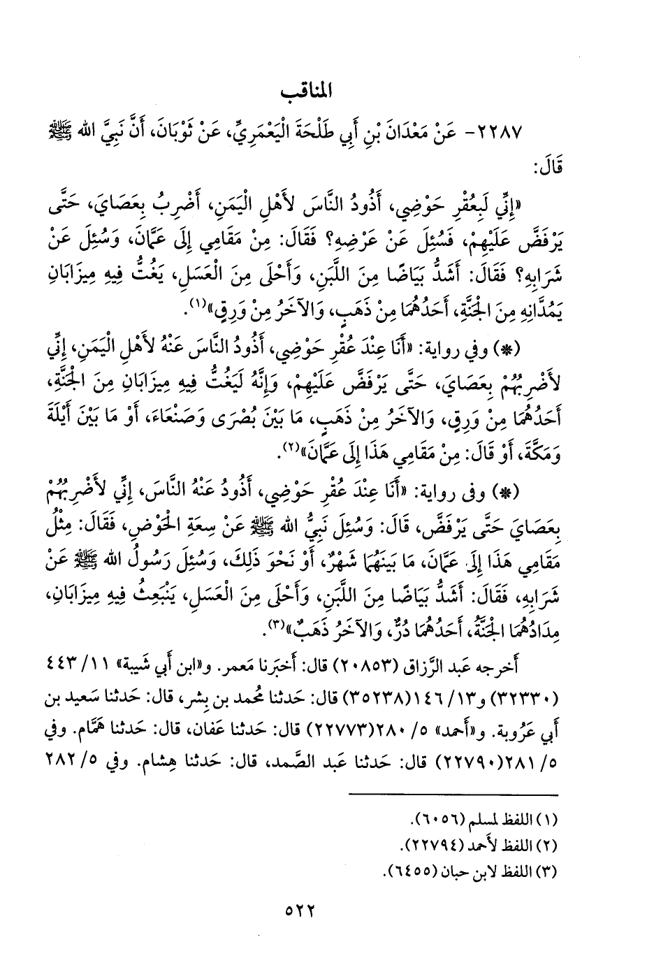 - وفي رواية: «إِني لبعقر الحوض يوم القيامة، أَذود عنه الناس لأَهل اليمن، أَضربهم بعصاي حتى يرفض عليهم، قال: فسئِل رسول الله صَلى الله عَليهِ وسَلمَ عن عرضه، فقال: من مقامي هذا إِلى عمان، وسئِل عن شرابه، فقال: أَشد بياضا من اللبن، وأَحلى من العسل، يعب فيه ميزابان، يمدانه من الجنة، أَحدهما ذهب، والآخر ورق» (¬٣).