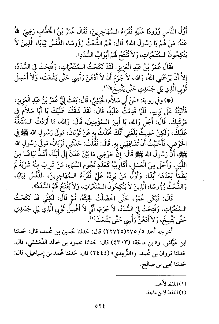قال: فبكى عمر، حتى اخضلت لحيته، ثم قال: لكني قد نكحت المنعمات، وفتحت لي السدد، لا جرم، أني لا أغسل ثوبي الذي يلي جسدي حتى يتسخ، ولا أدهن رأسي حتى يشعث (¬١).