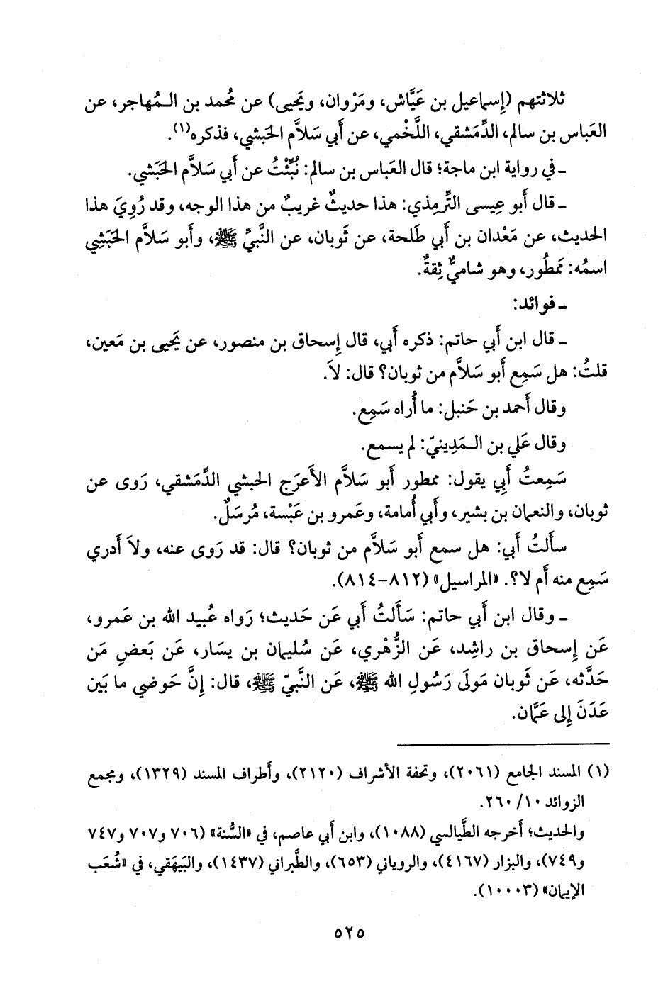 - قلنا: إِسناده ضعيفٌ؛ قال ابن أبي حاتم: ذكره أبي، قال إسحاق بن منصور، عن يحيى بن مَعين، قلت: هل سمع أَبو سلام من ثوبان؟ قال: لا.