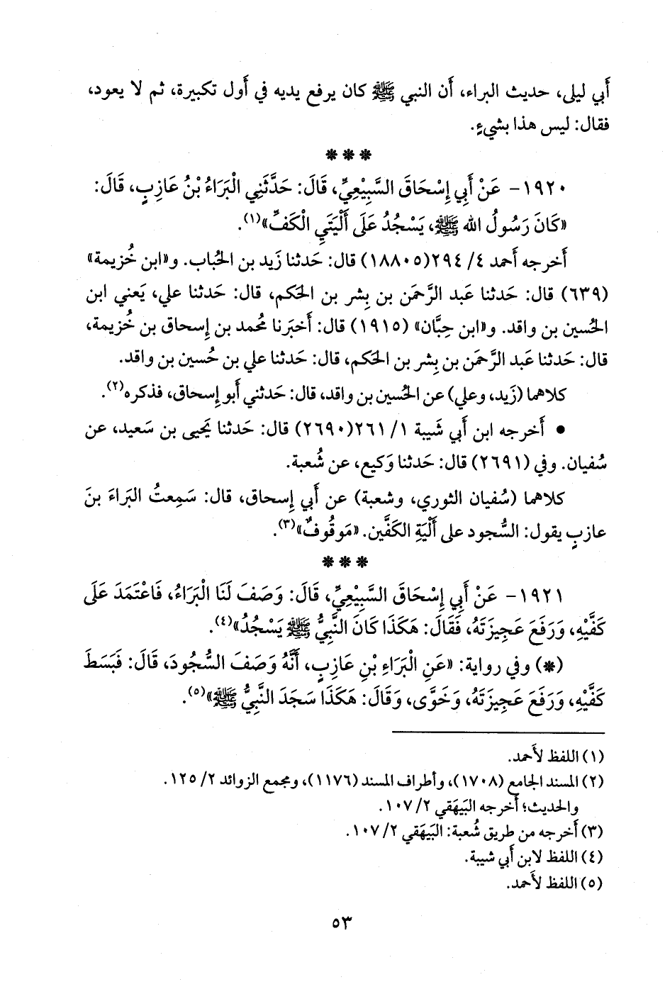١٩٢١ - عن أبي إسحاق الهَمْداني، قال: وصف لنا البراء، فاعتمد على كفيه، ورفع عجيزته، فقال: هكذا كان النبي صَلى الله عَليه وسَلم يسجد» (¬١).