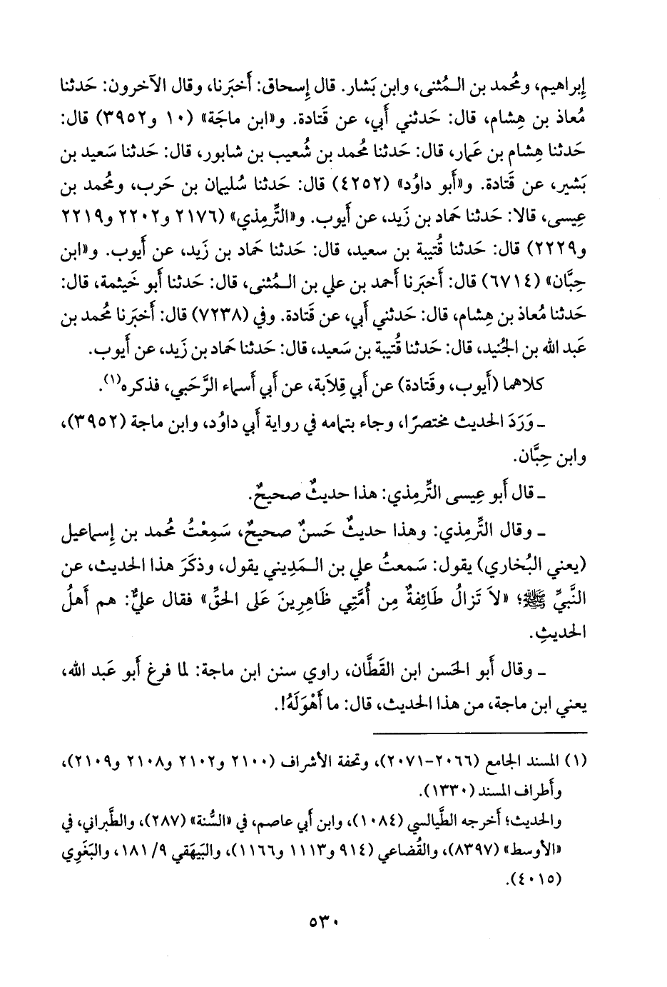 - وقال التِّرمِذي: هذا حديثٌ حسنٌ صحيحٌ، سمعت محمد بن إسماعيل، يعني البخاري، يقول: سمعت علي بن المديني يقول، وذكر هذا الحديث، عن النبي صَلى الله عَليه وسَلم؛ «لا تزال طائفة من أمتي ظاهرين على الحق» فقال علي: هم أهل الحديث.