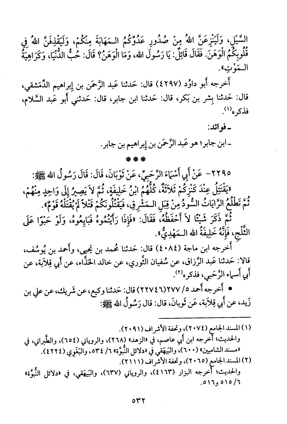 - أخرجه أحمد (٢٢٧٤٦) قال: حدثنا وكيع، عن شريك، عن علي بن زيد، عن أبي قلابة، عن ثوبان، قال: قال رسول الله صَلى الله عَليه وسَلم:
