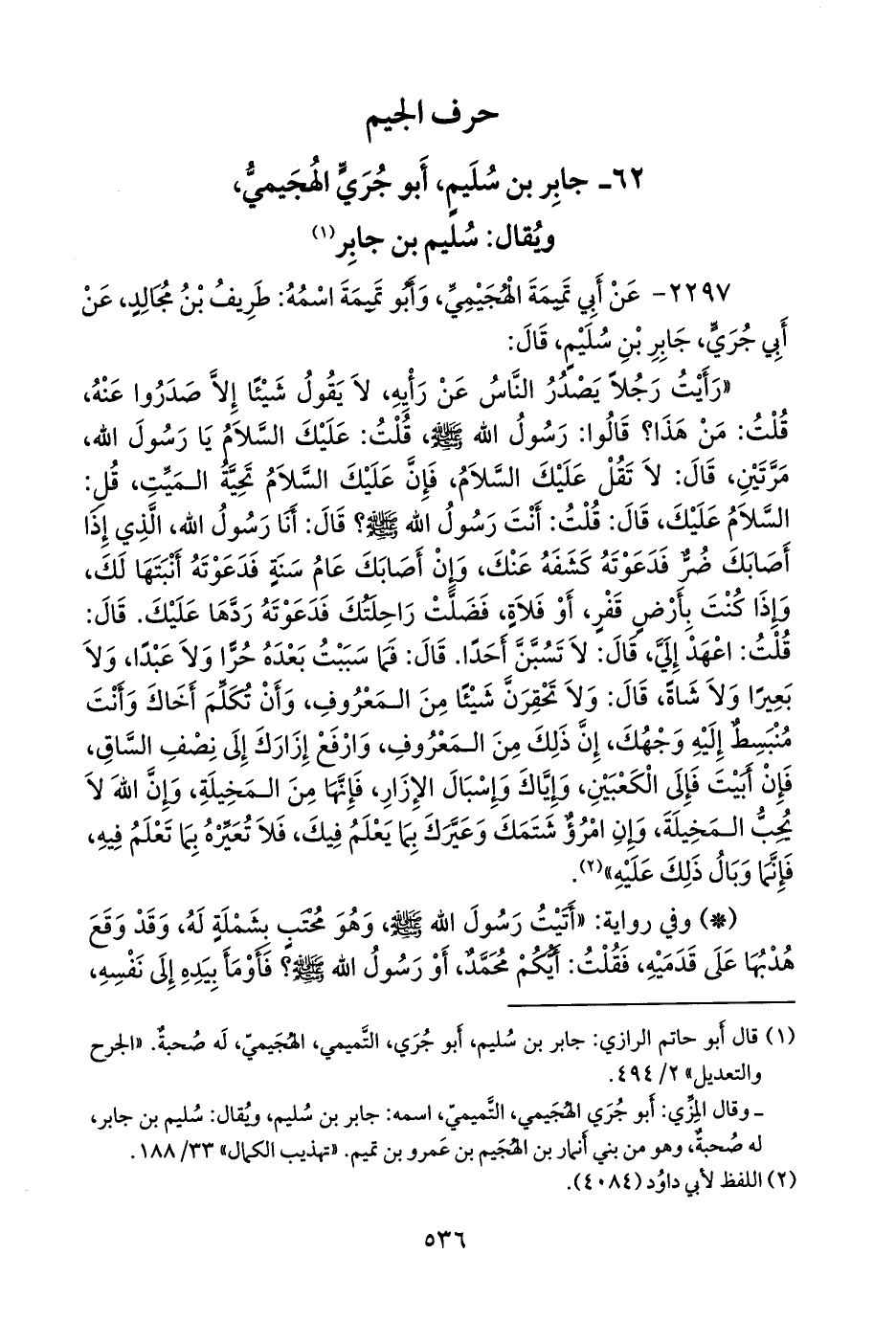 ٢٢٩٧ - عن أبي تميمة الهجيمي، وأَبو تميمة اسمه: طريف بن مجالد، عن أبي جري جابر بن سليم، قال:
