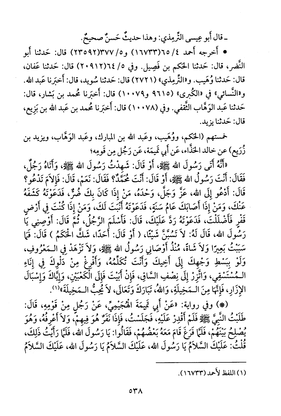 - وفي رواية: «عن أبي تميمة الهجيمي، عن رجل من قومه، قال: طلبت النبي صَلى الله عَليه وسَلم فلم أقدر عليه، فجلست، فإذا نفر هو فيهم، ولا أعرفه، وهو يصلح بينهم، فلما فرغ قام معه بعضهم، فقالوا: يا رسول الله، فلما رأيت ذلك، قلت: عليك السلام يا رسول الله، عليك السلام يا رسول الله، عليك السلام