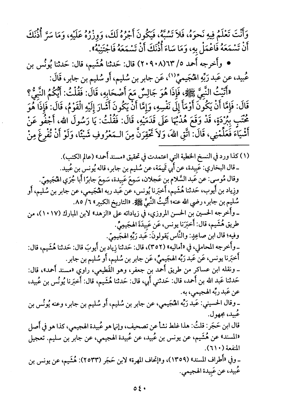 قال ابن حجر: قلت: هذا غلط نشأ عن تصحيف، وإنما هو عبيدة الهجيمي، كذا هو في أصل «المسند» عن هُشيم، عن يونس بن عبيد، عن عبيدة الهجيمي، عن جابر بن سليم. تعجيل المنفعة (٦١٠).