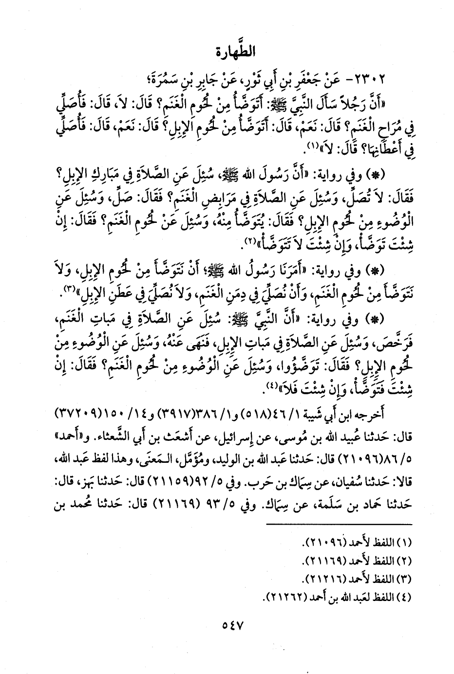 - وفي رواية: «أن النبي صَلى الله عَليه وسَلم: سُئِل عن الصلاة في مبات الغنم، فرخص، وسئل عن الصلاة في مبات الإبل، فنهى عنه، وسئل عن الوضوء من لحوم الإبل؟ فقال: توضؤوا، وسئل عن الوضوء من لحوم الغنم؟ فقال: إن شئت فتوضأ، وإن شئت فلا» (¬٤).