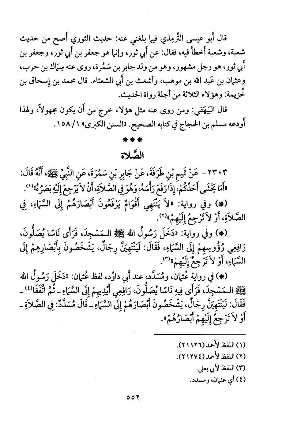 - وفي رواية: «دخل رسول الله صَلى الله عَليه وسَلم المسجد، فرأى ناسا يصلون، رافعي رؤوسهم إلى السماء، فقال: لينتهين رجال، يشخصون بأبصارهم إلى السماء، أو لا ترجع إليهم» (¬٣).