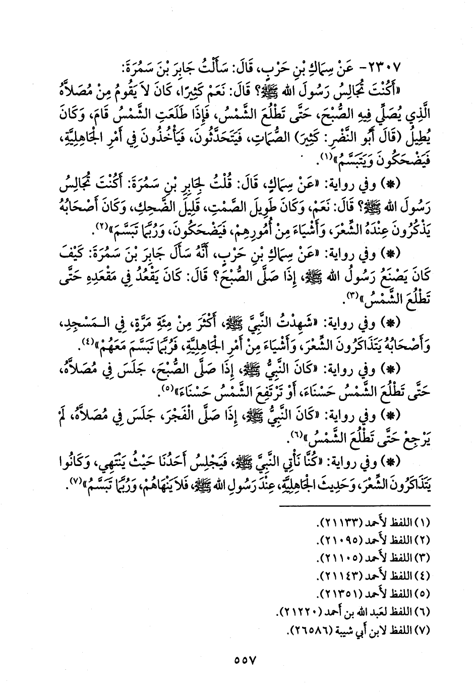 «أكنت تجالس رسول الله صَلى الله عَليه وسَلم؟ قال: نعم كثيرا، كان لا يقوم من مصلاه الذي يصلي فيه الصبح، حتى تطلع الشمس، فإذا طلعت الشمس قام، وكان يطيل (قال أَبو النضر: كثير) الصمات، فيتحدثون، فيأخذون في أمر الجاهلية، فيضحكون ويتبسم» (¬١).