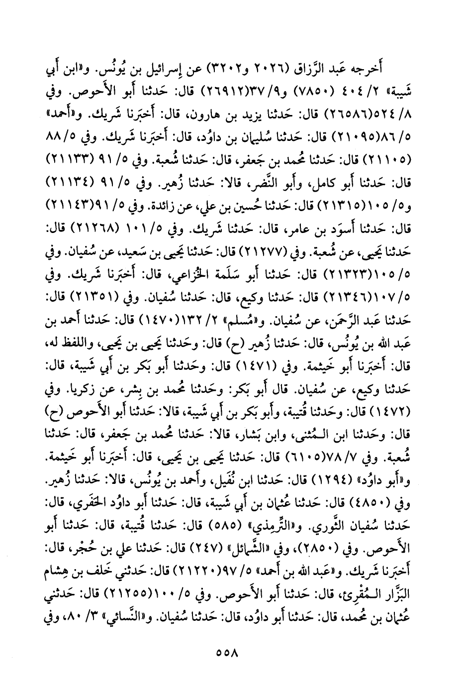قال أَبو بكر: وحدثنا محمد بن بشر، عن زكريا. وفي (١٤٧٢) قال: وحدثنا قتيبة، وأَبو بكر بن أبي شيبة، قالا: حدثنا أَبو الأحوص (ح) قال: وحدثنا ابن المثنى, وابن بشار, قالا: حدثنا محمد بن جعفر، قال: حدثنا شعبة. وفي ٧/ ٧٨ (٦١٠٥) قال: حدثنا يحيى بن يحيى، قال: أخبرنا أَبو خيثمة. و «أَبو داود» (١٢٩٤) قال: حدثنا ابن نفيل، وأحمد بن يونس، قالا: حدثنا زهير. وفي (٤٨٥٠) قال: حدثنا عثمان بن أبي شيبة، قال: حدثنا أَبو داود الحَفَري، قال: حدثنا سفيان الثوري. و «التِّرمِذي» (٥٨٥) قال: حدثنا قتيبة، قال: حدثنا أَبو الأحوص. وفي (٢٨٥٠)، وفي «الشمائل» (٢٤٧) قال: حدثنا علي بن حُجْر، قال: أخبرنا شريك. و «عبد الله بن أحمد» ٥/ ٩٧ (٢١٢٢٠) قال: حدثني خلف بن هشام البزار المُقرِئ، قال: حدثنا أَبو الأحوص. وفي ٥/ ١٠٠ (٢١٢٥٥) قال: حدثني عثمان بن محمد، قال: حدثنا أَبو داود، قال: حدثنا سفيان. و «النَّسَائي» ٣/ ٨٠، وفي