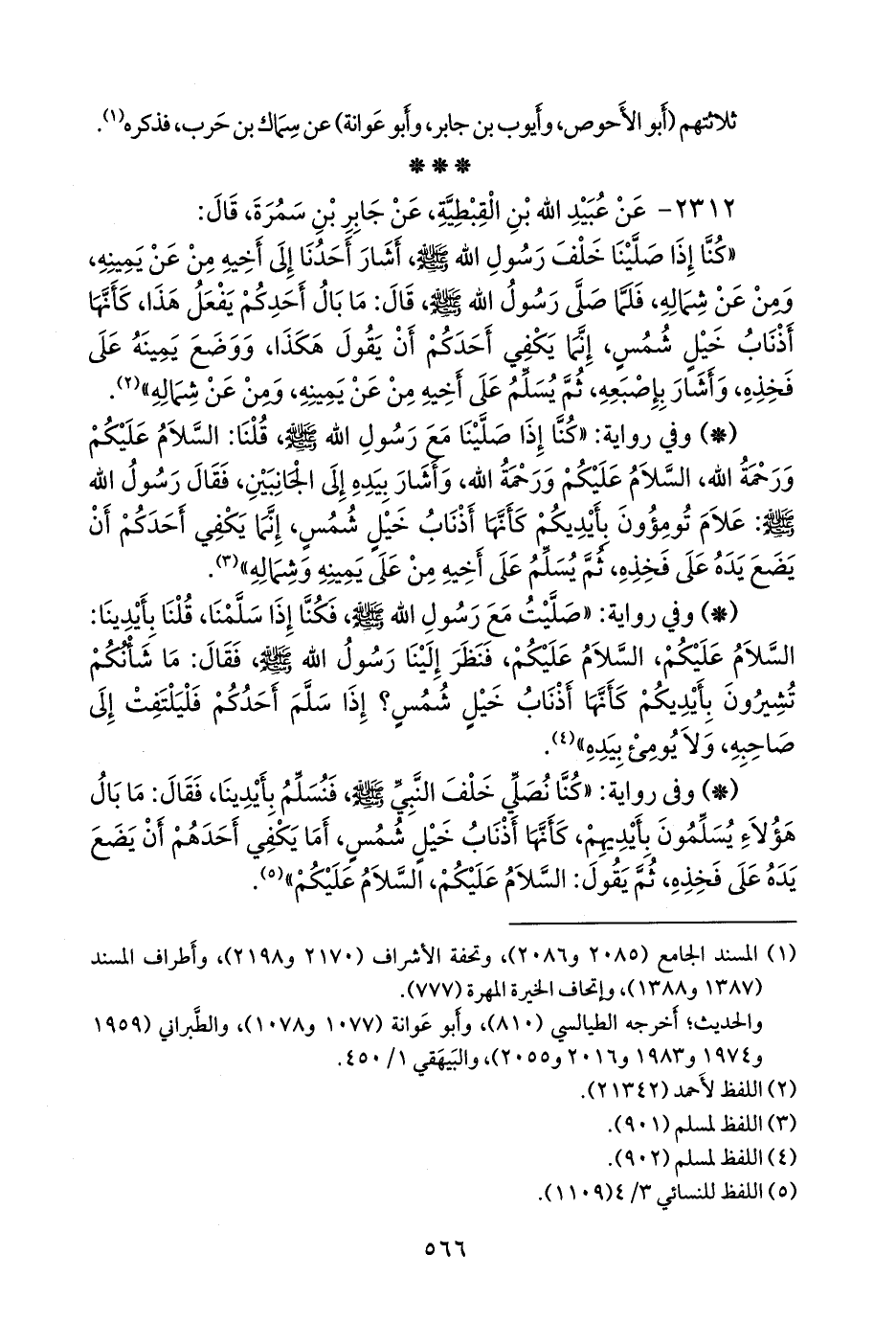 - وفي رواية: «كنا نصلي خلف النبي صَلى الله عَليه وسَلم فنسلم بأيدينا، فقال: ما بال هؤلاء يسلمون بأيديهم، كأنها أذناب خيل شمس، أما يكفي أحدهم أن يضع يده على فخذه، ثم يقول: السلام عليكم، السلام عليكم» (¬٤).