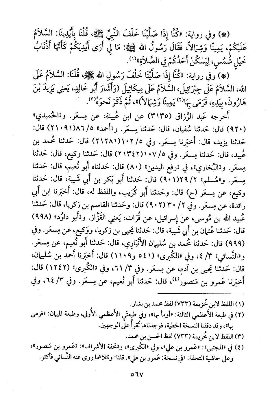 - وفي رواية: «كنا إذا صلينا خلف رسول الله صَلى الله عَليه وسَلم قلنا: السلام على الله، السلام على جبرائيل، السلام على ميكائيل (وأشار أَبو خالد، يعني يزيد بن هارون، بيده، فرمى بها (¬٢) يمينا وشمالا)»، ثم ذكر نحوه (¬٣).