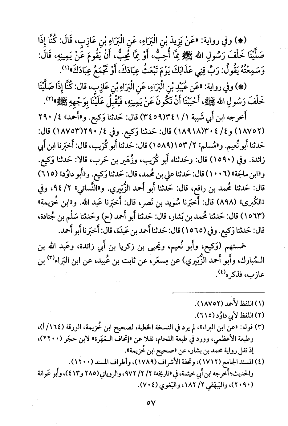 خمستهم (وكيع بن الجراح، وأَبو نُعيم الفضل بن دُكَين، ويحيى بن زكريا ابن أَبي زائدة، وأَبو أَحمد الزُّبَيري محمد بن عبد الله بن الزبير، وعبد الله بن المُبارك) عن مِسعَر بن كدام، عن ثابت بن عُبيد، عن ابن البراء بن عازب، فذكره (¬١).