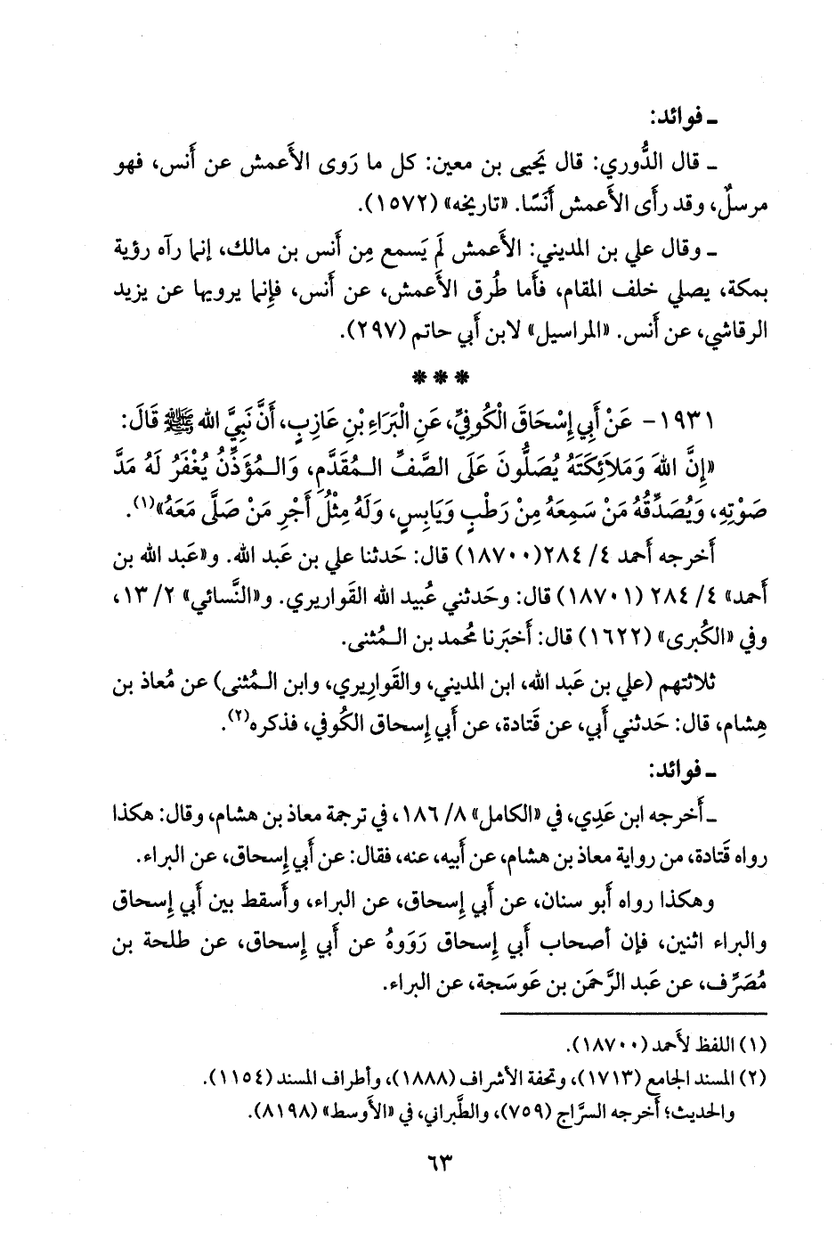 - وأخرجه في ترجمة سعيد بن سنان ٤/ ٤٠٤: وقال: وهذا كل من قال فيه: عن أبي إسحاق، عن البراء، فقد أخطأ، وسعيد بن سنان ممن قال ذلك، وتابعه عليه غيره، وأخطؤوا حيث قالوا: عن البراء، وإنما يروي هذا الحديث أَبو إسحاق، عن طلحة بن مُصَرِّف، عن عبد الرَّحمَن بن عوسجة، عن البراء.