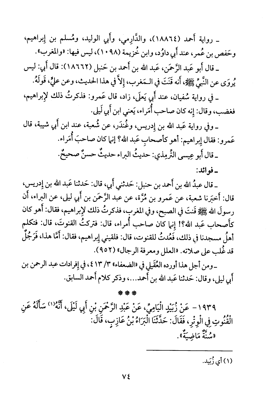- قال العُقيلي: حدثنا عبد الله بن أَحمد، يعني ابن حنبل، قال: حدثنا أَبي، قال: حدثنا عبد الله بن إِدريس، قال: أَخبرنا شعبة، عن عَمرو بن مُرَّة، عن عبد الرَّحمَن بن أَبي ليلى، عن البراء، أَن رسول الله صَلى الله عَليه وسَلم قنت في الصبح وفي المغرب، فذكرتُ ذلك لإِبراهيم، فقال: أَهو كان كأَصحاب عبد الله؟! إِنما كان صاحبَ أُمراء، قال: فتركتُ القنوت، فتَكلم أَهل مسجدنا في ذلك، فعدتُ للقنوت، قال: فلقيني إِبراهيم، فقال: أَما هذا فرجلٌ قد غُلب على صلاته. «الضعفاء» ٣/ ٤١٣، و «العلل ومعرفة الرجال» (٩٥٢).