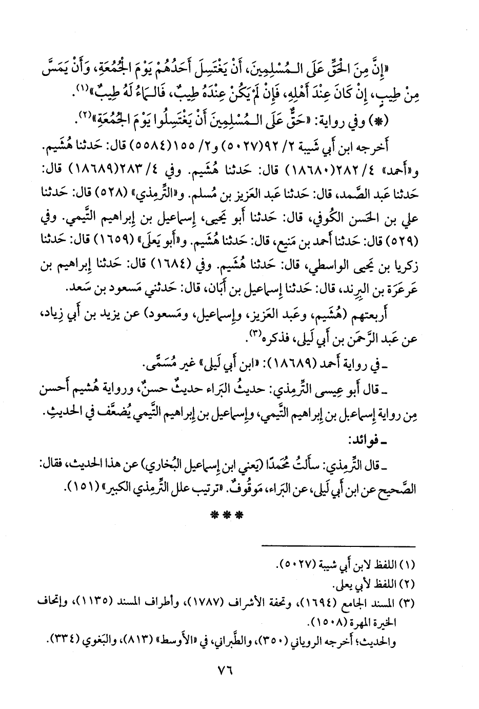 - قال التِّرمِذي: حديث البراء حديثٌ حسنٌ، ورواية هُشيم أحسن من رواية إسماعيل بن إبراهيم التيمي، وإسماعيل بن إبراهيم التيمي يضعف في الحديث.