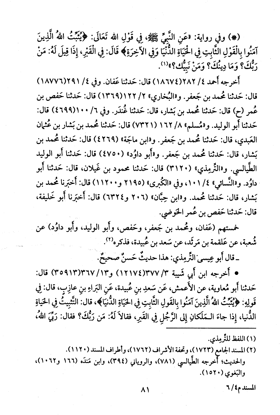 - أخرجه ابن أبي شيبة (١٢١٧٤) و ١٣/ ٣٦٧ (٣٥٩١٣) قال: حدثنا أَبو معاوية، عن الأعمش، عن سعد بن عُبَيدة، عن البراء بن عازب، قال: في قوله: {يثبت الله الذين آمنوا بالقول الثابت في الحياة الدنيا}، قال: التثبيت في الحياة الدنيا، إذا جاء الملكان إلى الرجل في القبر، فقالا له: من ربك؟ فقال: ربي الله،