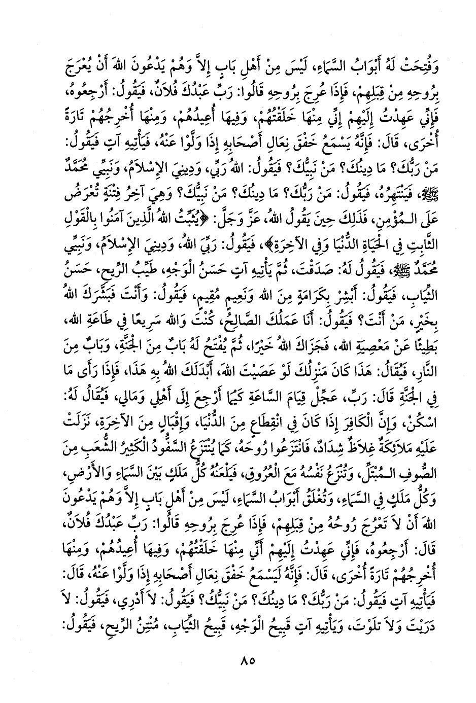 فيقول: ربي الله، وديني الإسلام، ونبيي محمد صَلى الله عَليه وسَلم فيقول له: صدقت، ثم يأتيه آت حسن الوجه، طيب الريح، حسن الثياب، فيقول: أبشر بكرامة من الله ونعيم مقيم، فيقول: وأنت فبشرك الله بخير، من أنت؟ فيقول: أنا عملك الصالح، كنت والله سريعا في طاعة الله، بطيئا عن معصية الله، فجزاك الله خيرا، ثم يفتح له باب من الجنة، وباب من النار، فيقال: هذا كان منزلك لو عصيت الله، أبدلك الله به هذا، فإذا رأى ما في الجنة قال: رب، عجل قيام الساعة كيما أرجع إلى أهلي ومالي، فيقال له: اسكن، وإن الكافر إذا كان في انقطاع من الدنيا، وإقبال من الآخرة، نزلت عليه ملائكة غلاظ شداد، فانتزعوا روحه، كما ينتزع السفود الكثير الشعب من الصوف المبتل، وتنزع نفسه مع العروق، فيلعنه كل ملك بين السماء والأرض، وكل ملك في السماء، وتغلق أَبواب السماء، ليس من أهل باب إلا وهم يدعون الله أن لا تعرج روحه من قبلهم، فإذا عرج بروحه قالوا: رب عبدك فلان، قال: أرجعوه، فإني عهدت إليهم أني منها خلقتهم، وفيها أعيدهم، ومنها أخرجهم تارة أخرى، قال: فإنه ليسمع خفق نعال أصحابه إذا ولوا عنه، قال: فيأتيه آت فيقول: من ربك؟ ما دينك؟ من نبيك؟ فيقول: لا أدري، فيقول: لا دريت ولا تلوت، ويأتيه آت قبيح الوجه، قبيح الثياب، منتن الريح، فيقول: