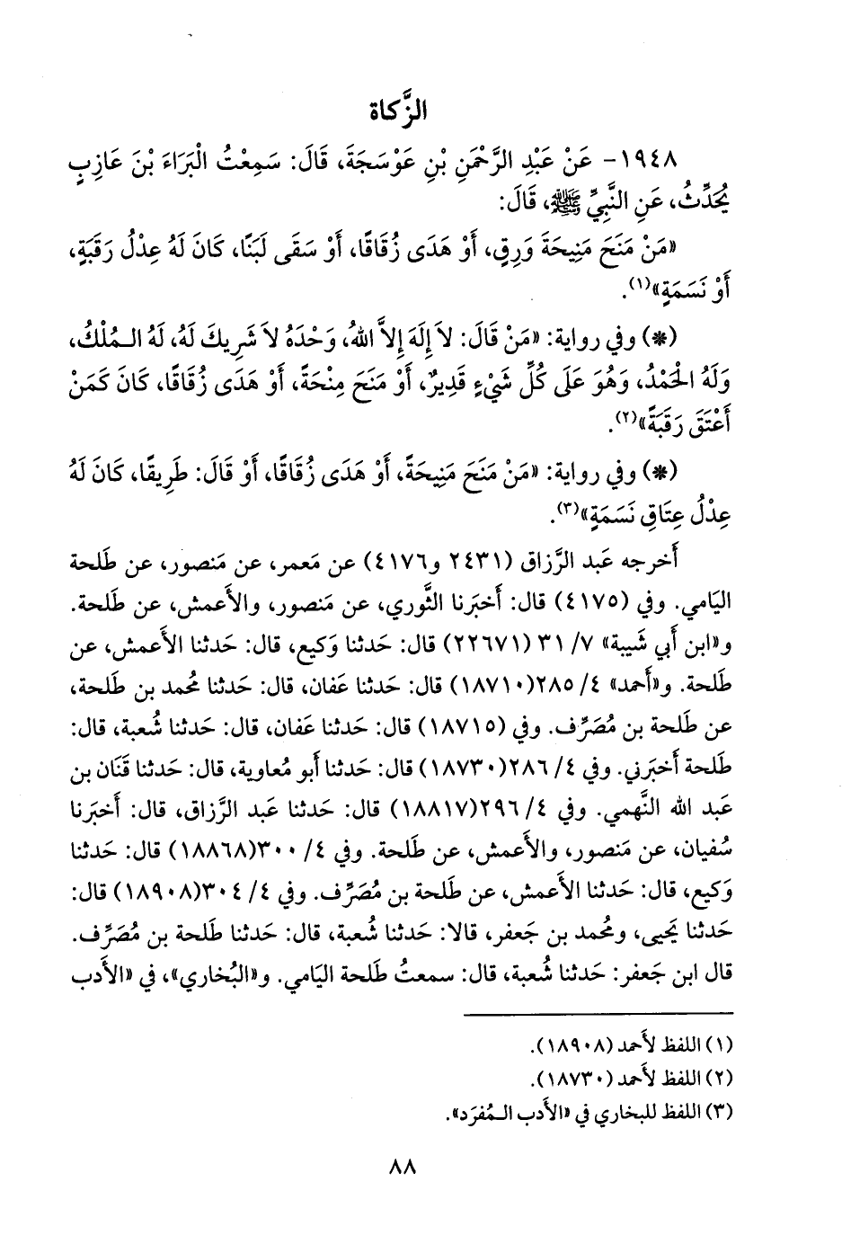 ١٩٤٨ - عن عبد الرَّحمَن بن عوسجة، قال: سمعت البراء بن عازب يحدث، عن النبي صَلى الله عَليه وسَلم قال: