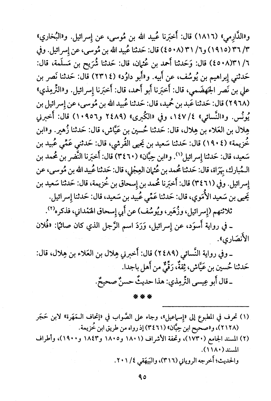 وفي ٦/ ٢٥ (٤٥٠٨) قال: وحدثنا أحمد بن عثمان، قال: حدثنا شريح بن مَسلَمة، قال: حدثني إبراهيم بن يوسف، عن أبيه. و «أَبو داود» (٢٣١٤) قال: حدثنا نصر بن علي بن نصر الجهضمي، قال: أخبرنا أَبو أحمد، قال: أخبرنا إسرائيل. و «التِّرمِذي» (٢٩٦٨) قال: حدثنا عَبد بن حُميد، قال: حدثنا عُبيد الله بن موسى، عن إسرائيل بن يونس. و «النَّسَائي» ٤/ ١٤٧، وفي «الكبرى» (٢٤٨٩ و ١٠٩٥٦) قال: أخبرني هلال بن العلاء بن هلال، قال: حدثنا حسين بن عياش، قال: حدثنا زهير. و «ابن خزيمة» (١٩٠٤) قال: حدثنا سعيد بن يحيى القرشي، قال: حدثني عمي عبيد بن سعيد، قال: حدثنا إسرائيل (¬١). و «ابن حِبَّان» (٣٤٦٠) قال: أخبرنا النضر بن محمد بن المبارك، بهراة، قال: حدثنا محمد بن عثمان العجلي، قال: حدثنا عُبيد الله بن موسى، عن إسرائيل. وفي (٣٤٦١) قال: أخبرنا محمد بن إسحاق بن خزيمة، قال: حدثنا سعيد بن يحيى بن سعيد الأُمَوي، قال: حدثنا عمي عبيد بن سعيد، قال: حدثنا إسرائيل.